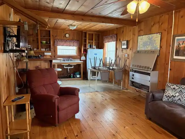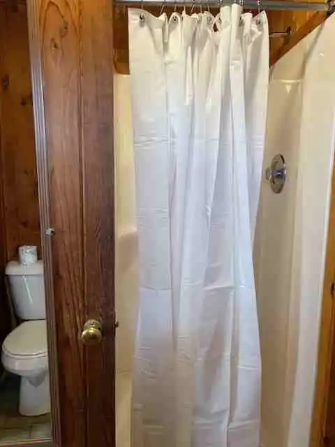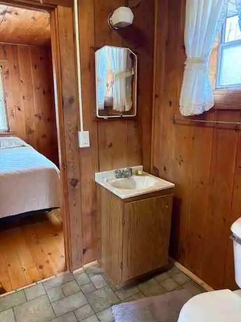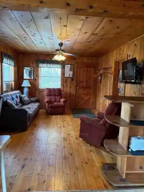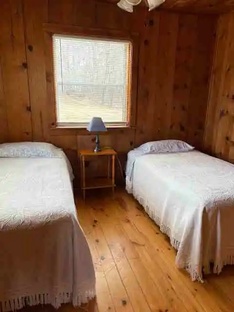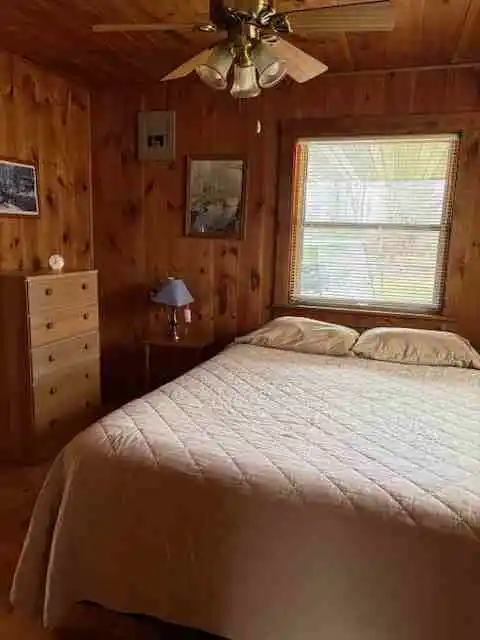 Cabin 2 is a two bedroom cabin with air conditioning that has a queen bed in one room and 2 single beds in the other. Sleeps up to five, handicapped access, gas heat, coffee maker, toaster, crock-pot, microwave, stove & fridge, charcoal grill, picnic table & lawn chairs, satellite TV.